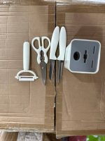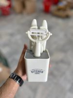 - محتویات بسته: ست شامل ۲ چاقو، ۱ پوستکن، ۱ قیچی و پایهای برای جلوگیری از تجمع آب است که همچنین از ورود گرد و غبار به ابزارها جلوگیری میکند.