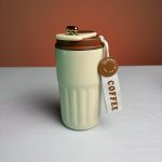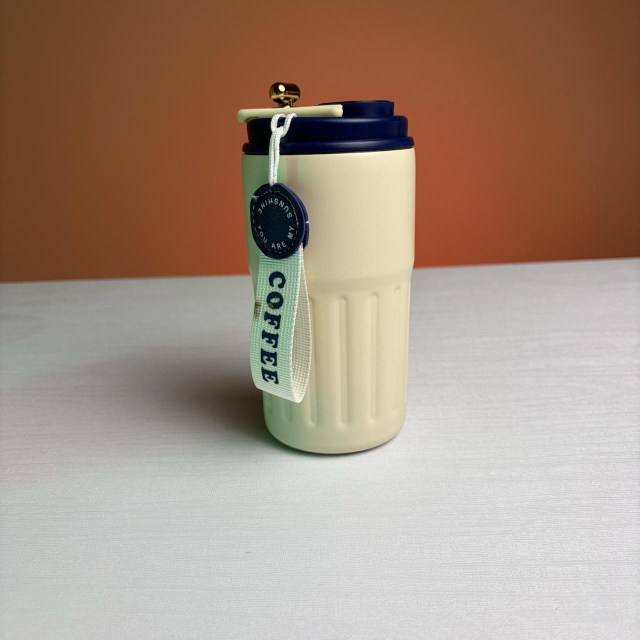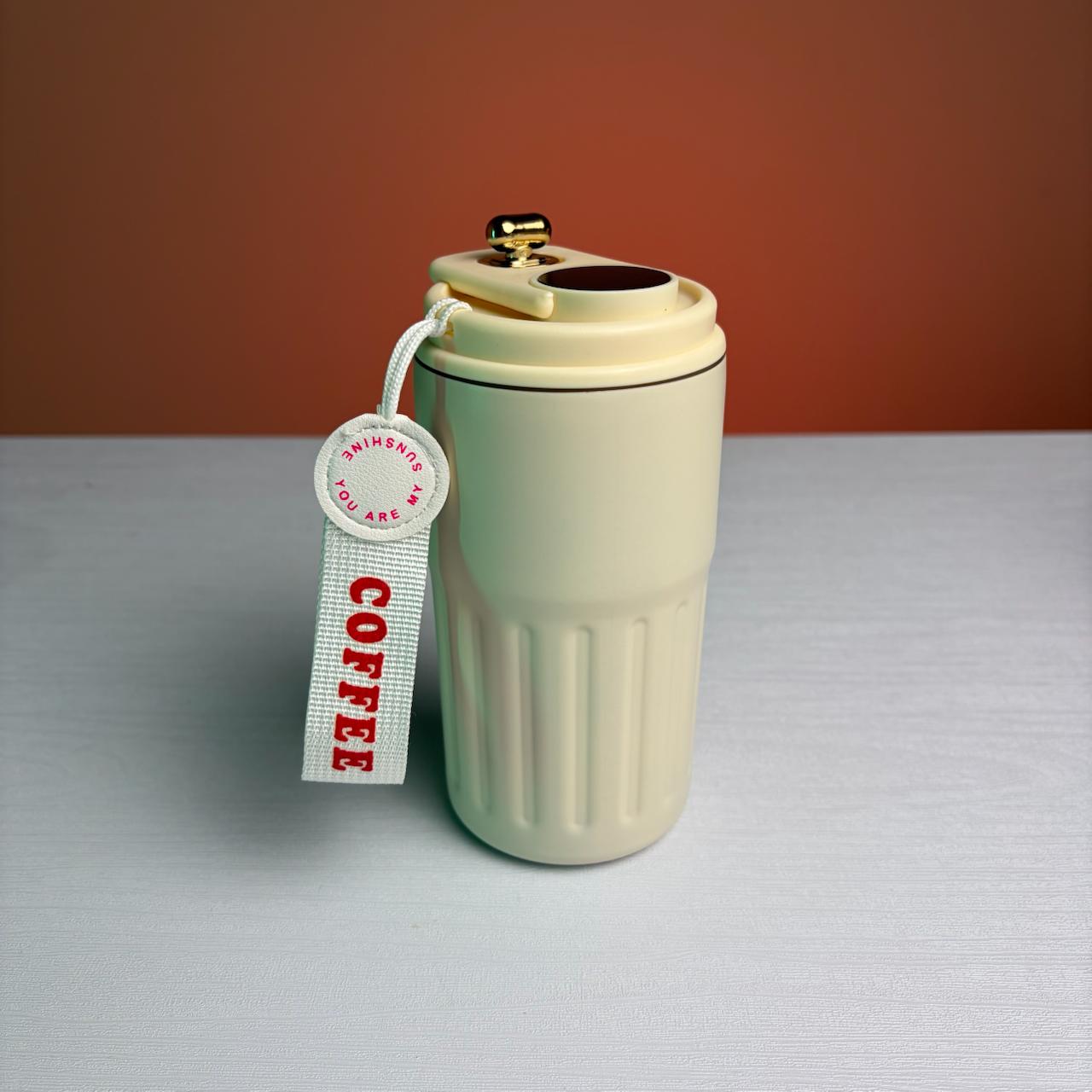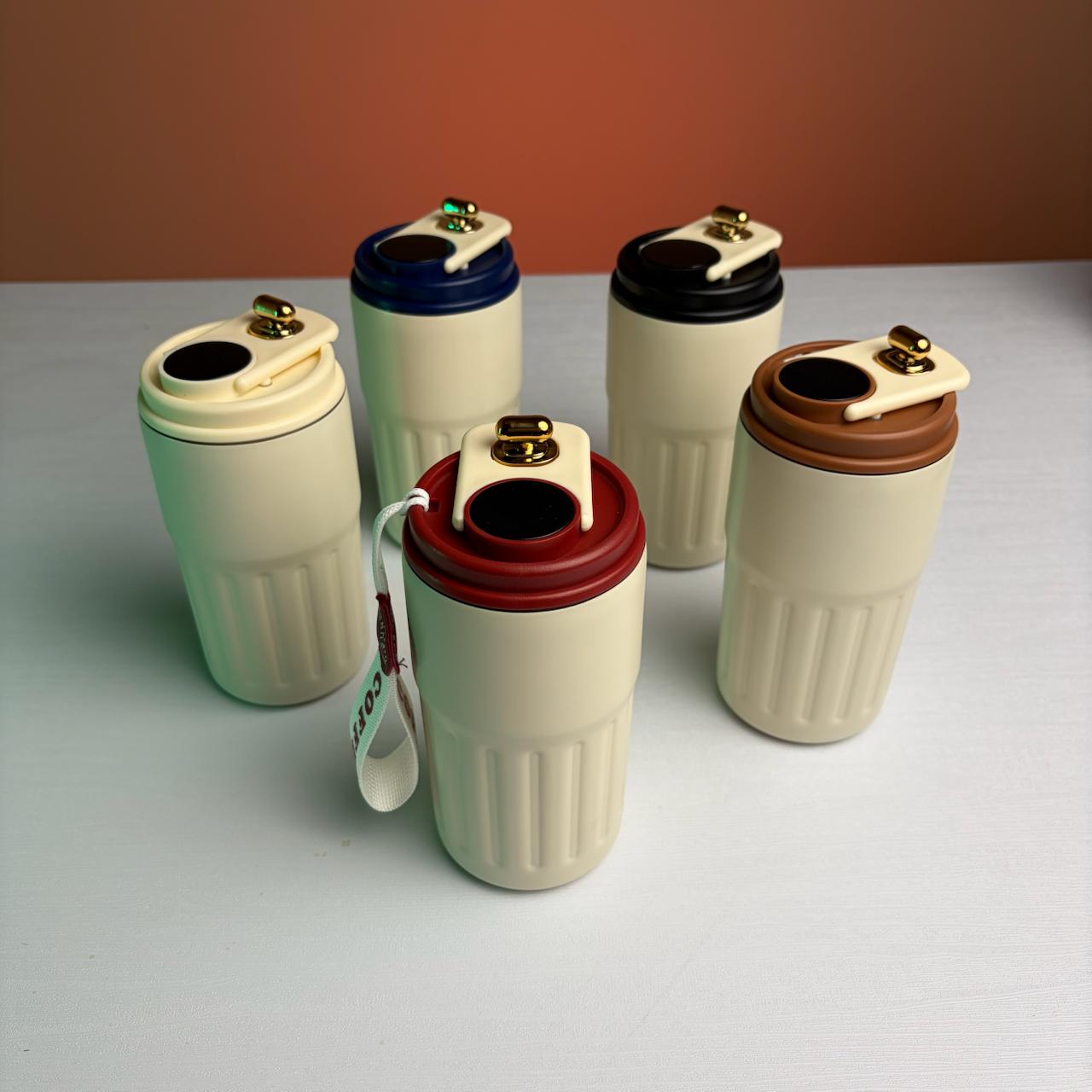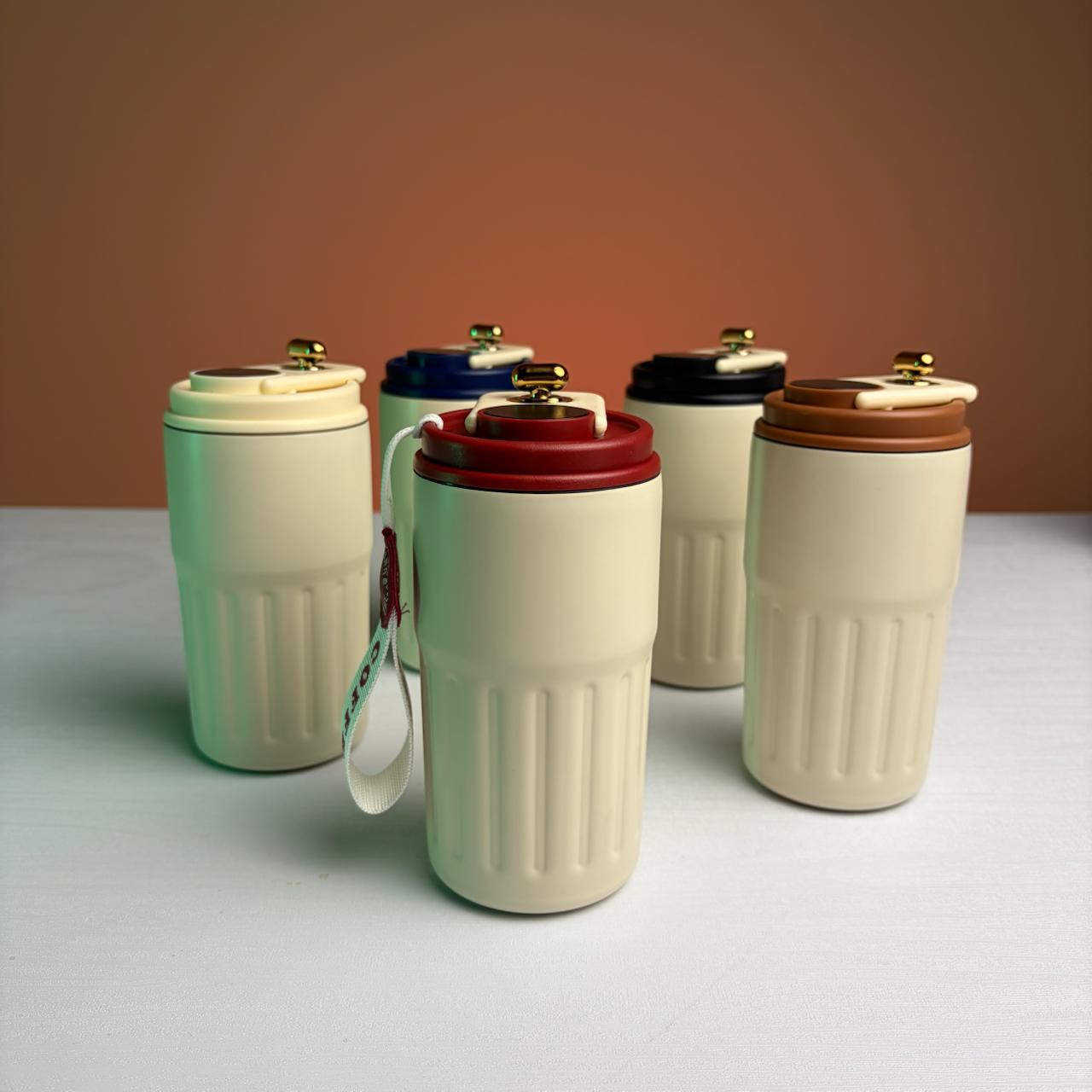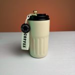 طراحی ارگونومیک و لوکس بدنه این ماگ دارای شیارهای عمودی است که نه تنها ظاهری کلاسیک و شیک به آن بخشیده، بلکه باعث میشود ماگ به خوبی در دست فیکس شود و لیز نخورد (Non-slip grip). یک بند آویز زیبا با نوشته “COFFEE” نیز حمل آن را آسان کرده است. درب محصول دارای قفل ضامندار طلایی/کروم است که هم زیبایی دارد و هم از باز شدن ناگهانی درب در کیف جلوگیری میکند.